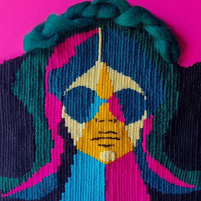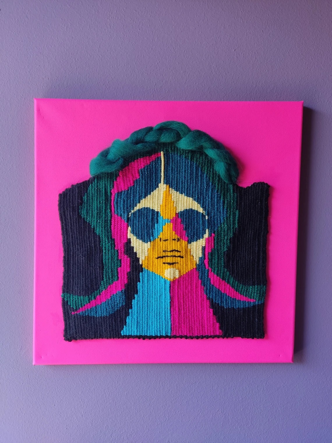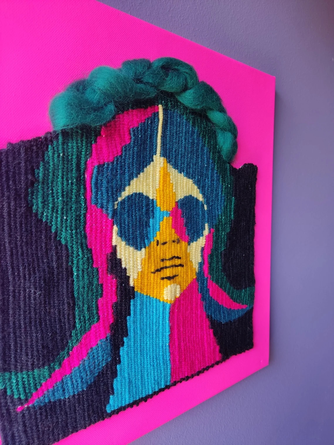 Contemporary weaving with original unique design. The weaving is made using acrylic yarn and merino wool. The weaving is attached to a canvas covered with pink fluo spray for mineral surfaces. Ideal for wall decoration.