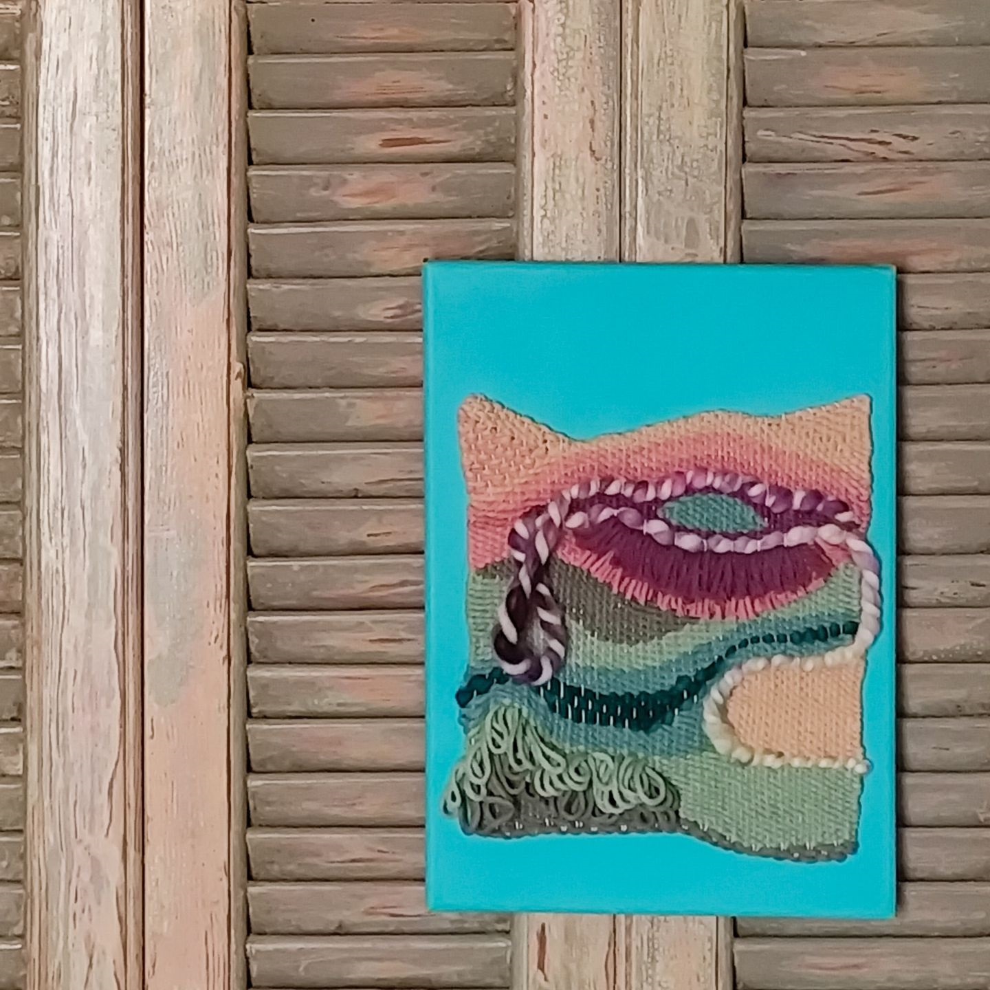Contemporary weaving with organic unique design. The weaving is made using 100% cotton yarn, merino wool, unique handspun yarn by Phoebe Jones. The weaving is attached to a canvas covered with blue spray for mineral surfaces. Ideal for wall decoration.